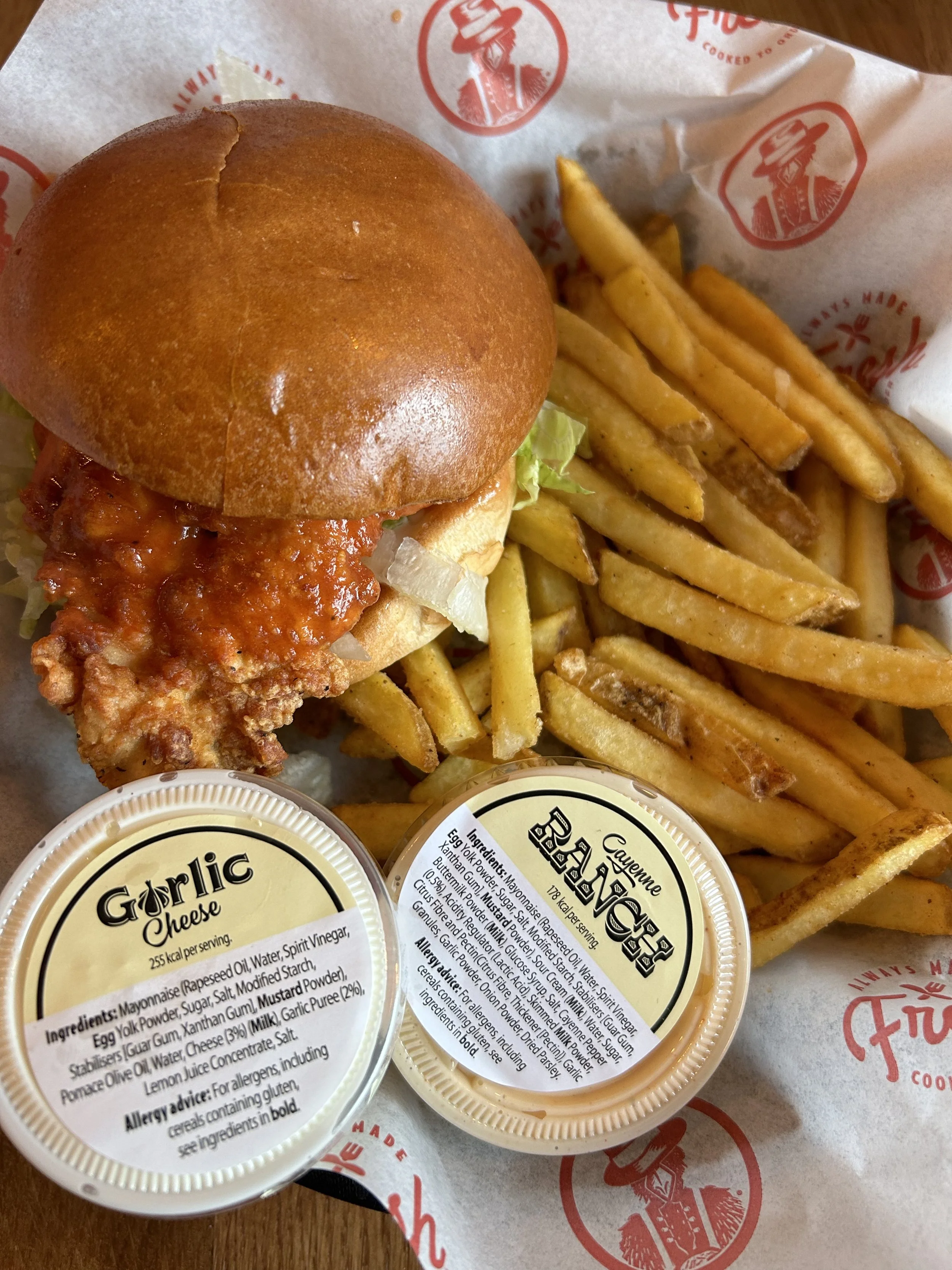 It’s nice to see some American house favourites like Ranch and Honey Mustard, some spice options, a little originality and innovation in Inferno and Slim Sauce, but in all honesty I found the sauces to be lacklustre, though I didn’t try them all. In all I tried (don’t judge me) Blue Cheese, Buffalo, Cayenne Ranch, Garlic Cheese, Gravy Mayo, House Ranch, Korean BBQ, and Spicy BBQ. Of these the only sauce that stood out to me was the Spicy BBQ which I got on their wings. It had right amounts tang, smack, and heat. But otherwise the Blue Cheese resembled just that without any new perspective, Buffalo fell a little flat on the sandwich you can see below. The Garlic Cheese didn’t pack punch of either of its name’s sake, the Gravy Mayo tasted Christmas-y if that’s at all possible, and the Korean BBQ wasn’t sure what it was trying to be. Both Ranch sauces had the base right, the buttermilk came through in particular, but similar to most of the sauces they didn’t hit you right in the tongue like sauces should. Might I add that any additional sauces dependent on meal come at extra cost.