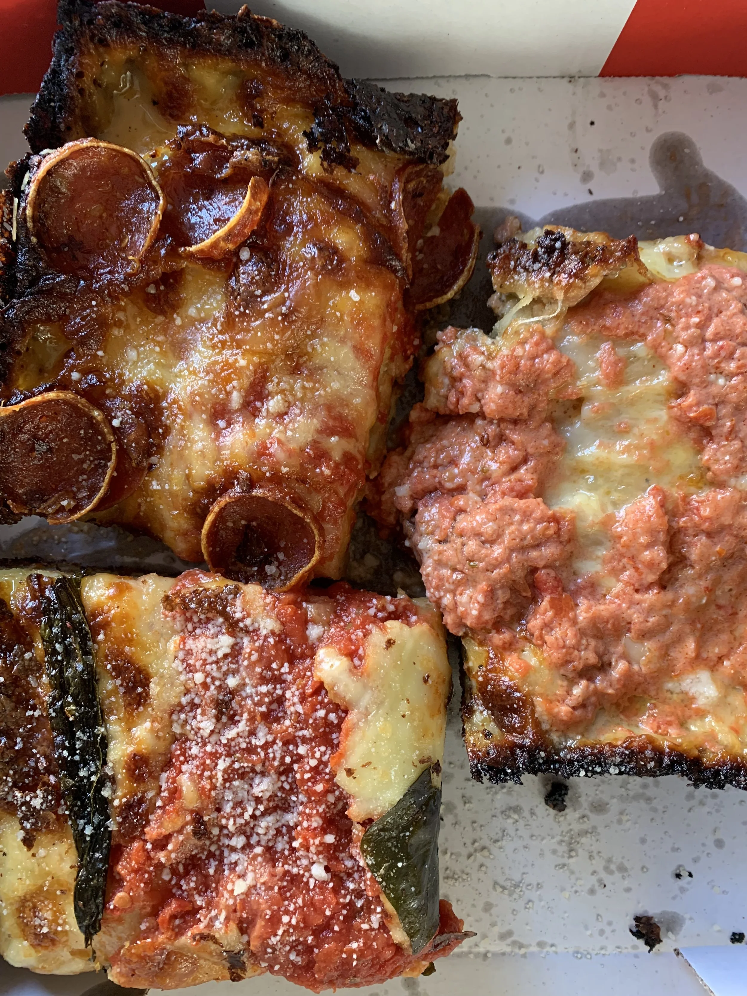 Evincing American inspiration specifically Detroit and Chicago styles, it similarly pays its respects to Sicilian or southern Italian pizza al taglio - which is proven in Thompson’s affinity for and sweatshirt of sfincione. Pizza al taglio is a typical street pizza picked up for a bite of lunch found from Rome to Palermo. Pan pizza using plenty of oil leads to a beautifully, basically fried crust which in Flout’s case is in the form of a Detroit-style cheese crisp. Walking into Flout Pizza brings about fond memories of Italy allowing one’s eyes to wander over and browse the pizza maestro’s wares, only to settle in this case on wanting it all.